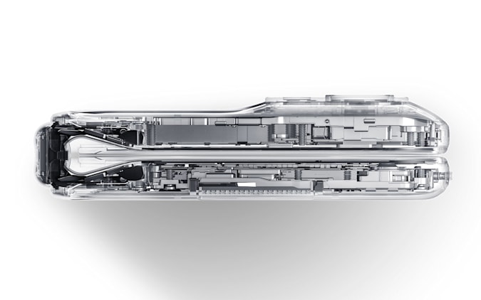 부러지는 가운데 힌지 부분을 90도, 180도가 아닌 위 사진처럼 물방울처럼 휘감고 있습니다. 우리가 종이를 접을 때 끝부분이 부풀어 있게 해놨어요. 따라서 곡률이 극단적이지 않기 때문에 주름이 적어 보입니다. 이런 기술은 이미 몇 년 전 중국 휴대폰에서 선보인 기술입니다. 다만 그때는 인폴딩 방식이 아니라 아웃폴딩 방식이었어요.