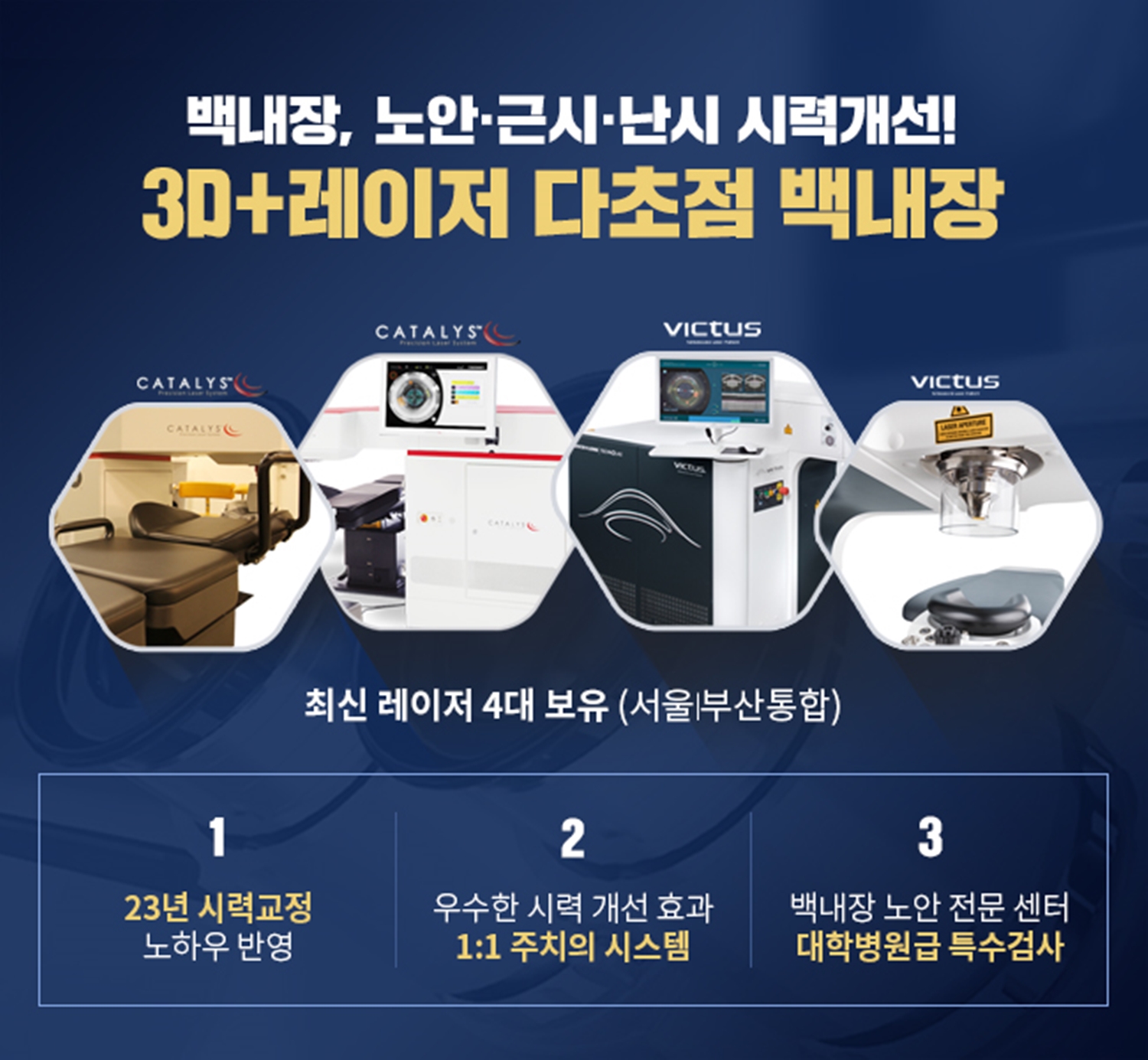 카탈리스 레이저를 이용해 정교한 전낭 절개를 통한 초점 진행이 가능하며 빅투스 레이저를 추가 도입해 총 4대로 듀얼 시스템 가동이 가능합니다.(서울~부산 합계)