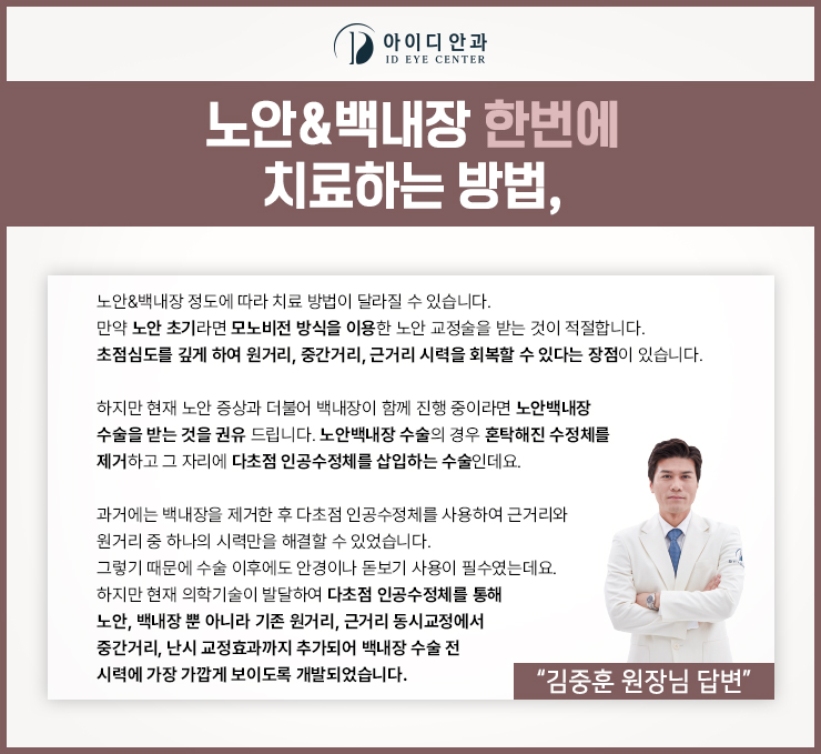 특히 노인성 백내장을 개선하기 위해서는 보다 정교하고 섬세한 과정이 필요합니다.이때 레이저와 인공수정체를 활용하여 노안 백내장을 개선할 수 있습니다.이 방법은 노안과 백내장이 동시에 나타나는 경우가 많아 두 증상을 동시에 케어하도록 개발된 기술이라고 할 수 있습니다.