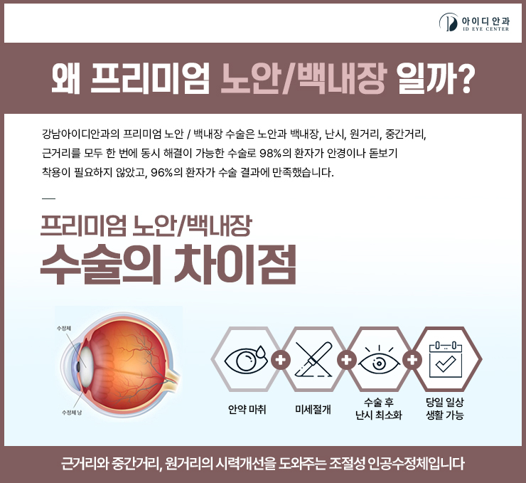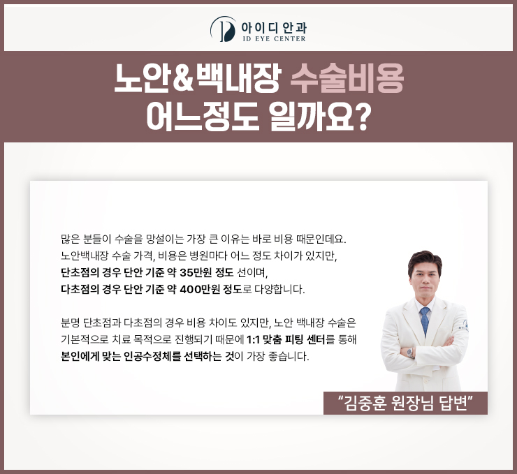 관리할 때 삽입하는 초점 인공수정체의 종류는 매우 다양합니다.따라서 백내장 수술 가격이 50~100만원까지 차이가 날 수 있습니다.그 이유는 특정 렌즈에 집착하는 것이 아니라 개개인의 눈 상태, 라이프스타일 등을 꼼꼼히 고려하기 때문입니다.중요하게 생각해야 할 것은 단지 렌즈의 가격이 아니라 자신에게 적절한 렌즈를 선택할 수 있는지 여부입니다.개개인의 안구에 적합한 렌즈를 삽입하여 백내장을 개선하고 보다 선명한 시야를 확보할 수 있으며 질 좋은 시력을 더 오래 유지할 수 있습니다.
