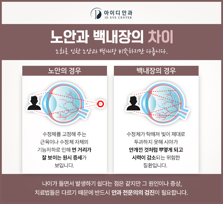 백내장은 노안과 같이 시력 저하를 일으키는 질환인데요.이 질환은 갈수록 안개가 낀 것처럼 서서히 시야가 흐려지고 혼탁해진다는 특징을 가지고 있습니다.또한 노안의 발생 시기와 비슷하기 때문에 40대 이상의 약 절반은 백내장을 경험하고 있다는 통계도 있습니다.그러나 노안과 다른 점은 근거리와 원거리에 있는 물건과도 잘 보이지 않는다는 것입니다.