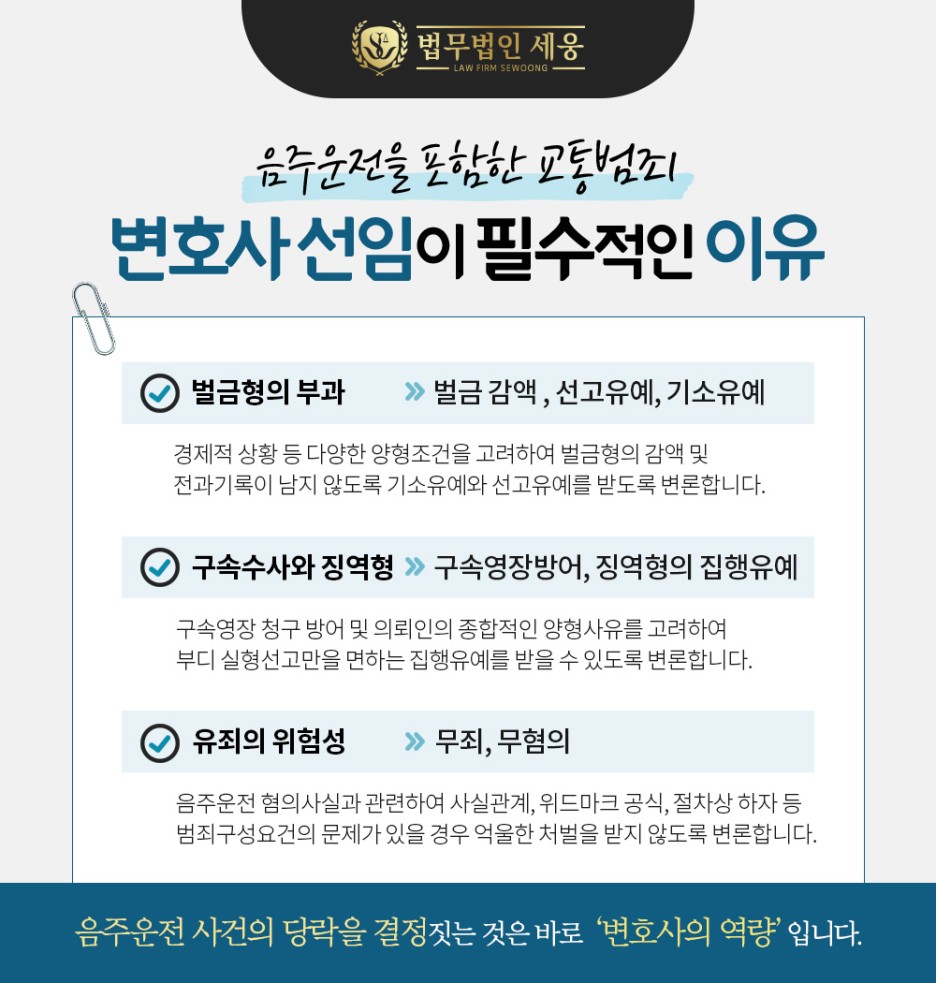 따라서 음주운전 선처가 필요한 상황이라면 자신의 상황에 맞는 다양한 체계적인 준비를 할 필요성이 높으며, 이 과정에서 특별한 전문성을 보유한 법무법인을 방문하는 것을 진지하게 고민할 필요성이 상당하다고 했습니다.