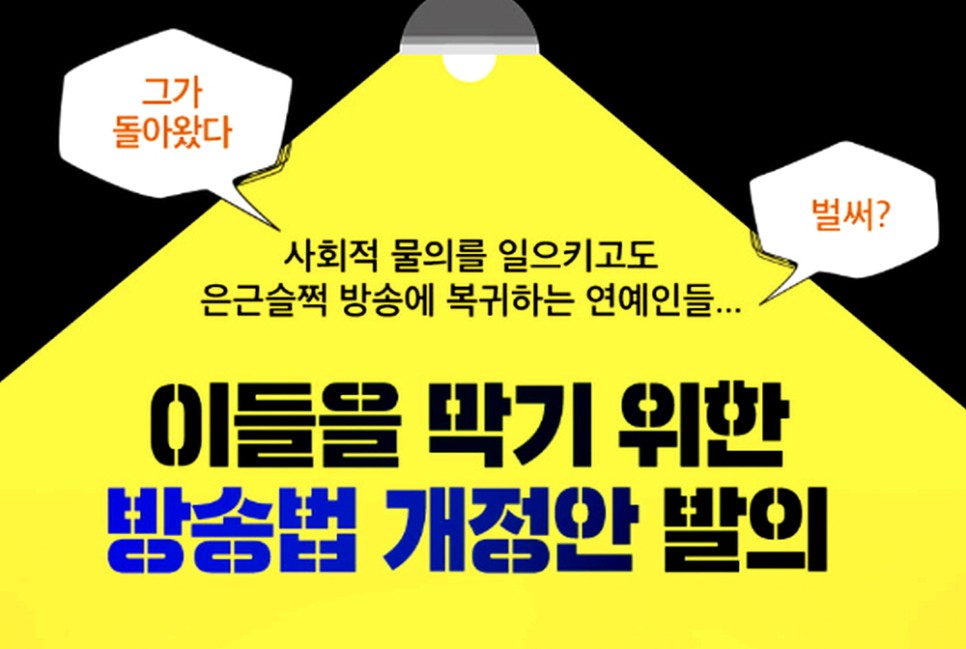 더불어민주당 오영훈 의원이 발의한 방송법 개정안에서는 위에서 언급한 죄목으로 문제를 일으킨 연예인들이 방송에 복귀하는 것을 금지하고, 방송 출연 자체를 할 수 없게 하는 것을 목적으로 하고 있습니다.