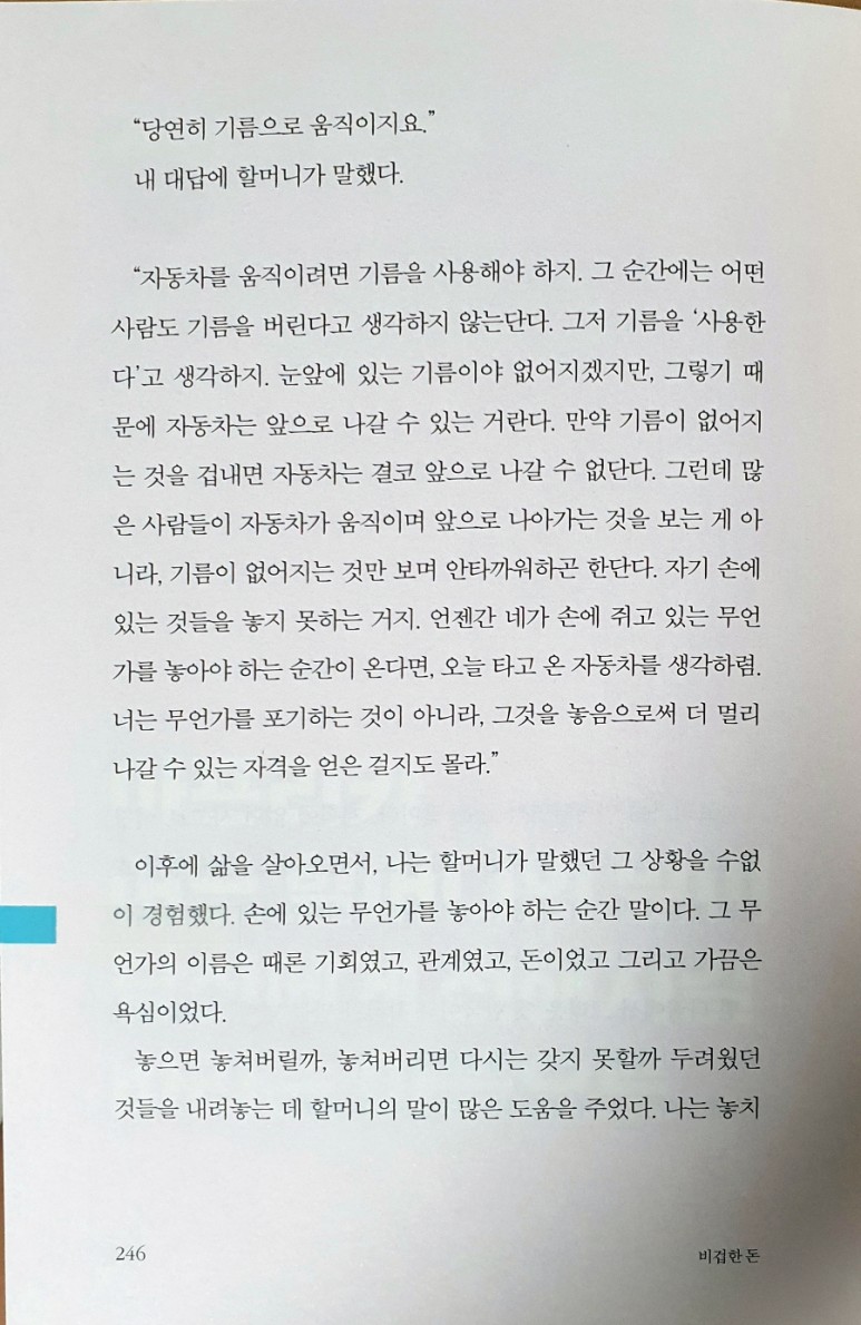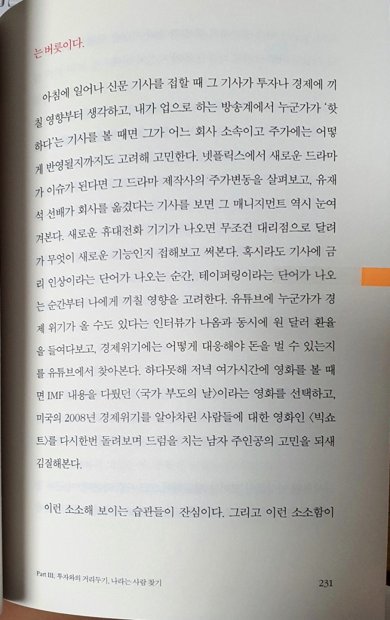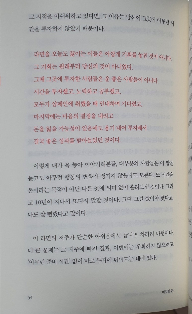 무언가를 포기하는 것이 아니라 그것을 놓음으로써 더 멀리 갈 수 있는 자격을 얻을지도 모른다. 손에 있는 무언가를 떼야 하는 순간. 때로는 기회요, 관계요, 돈이고, 때로는 갖고 싶었다.이 책은 투자에 관한 책이지만 삶을 대하는 태도도 많이 배웠다. 뿐만 아니라 확실히 성공한 사람들의 ‘기준’이 다르다는 것을 많이 느끼게 됐다. 내가 생각하는 휴식과 그가 생각하는 휴식은 다르고, 내가 열심이라고 생각하는 기준과 그가 생각하는 노력은 달랐다. 이 인터뷰 영상을 보고 바로 책을 구입했다. 인터뷰 영상을 꼭 한번 볼 것을 추천한다!