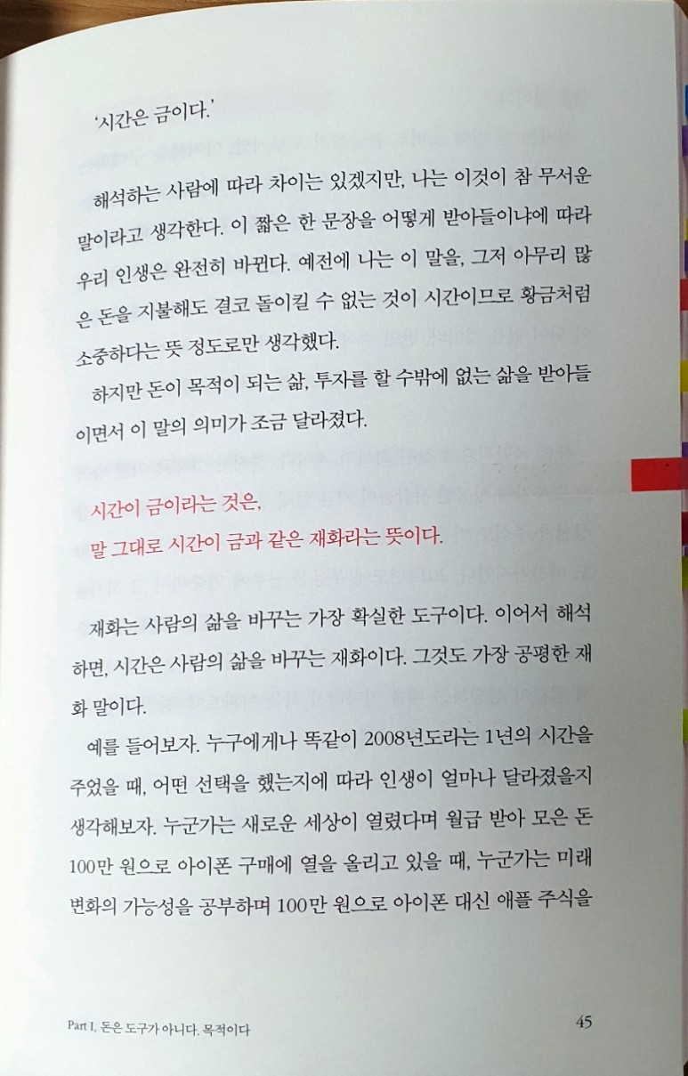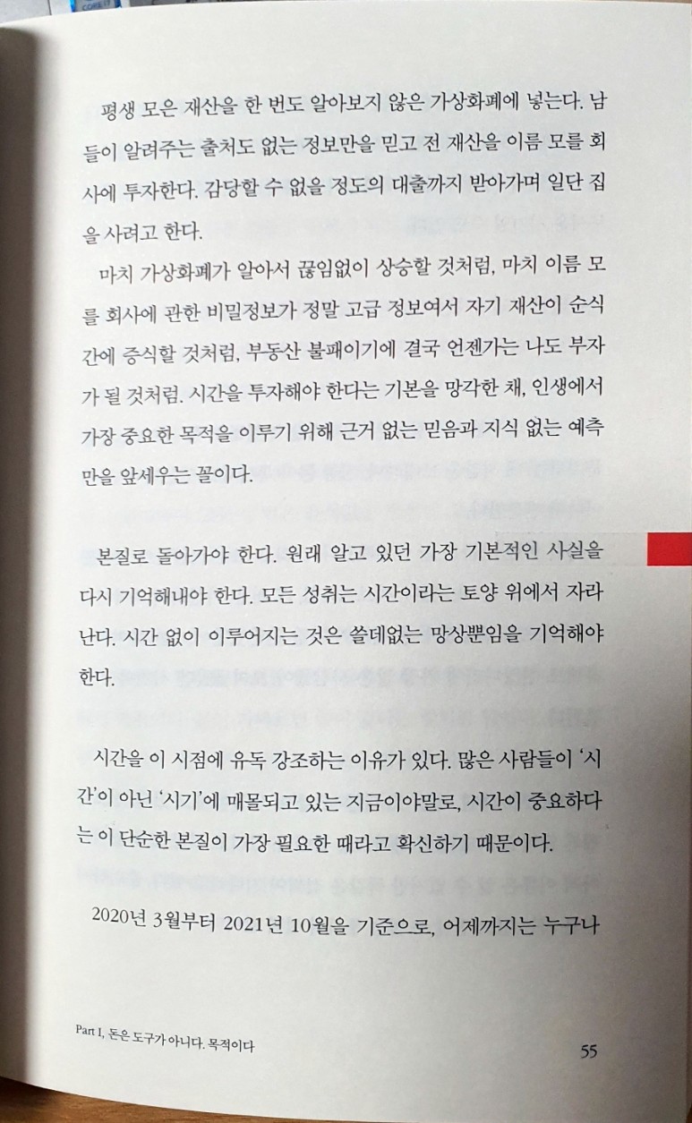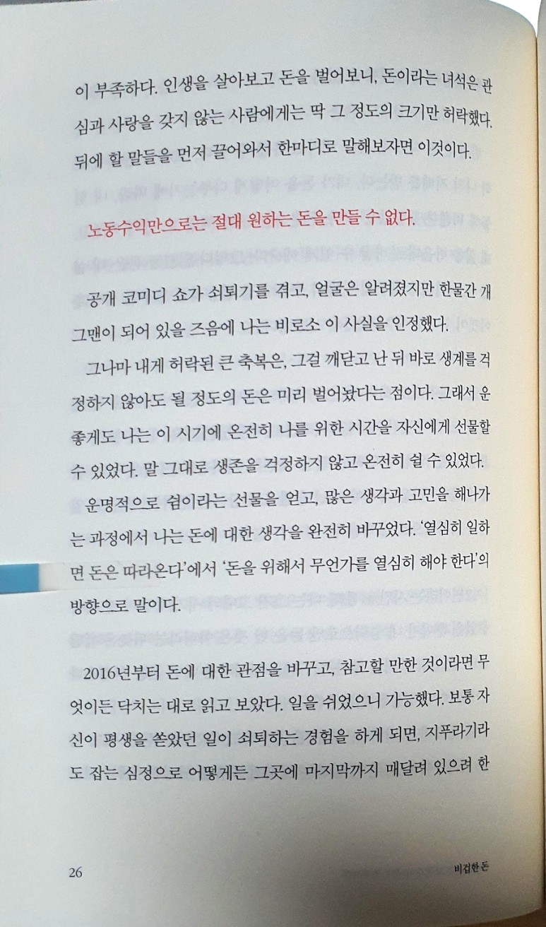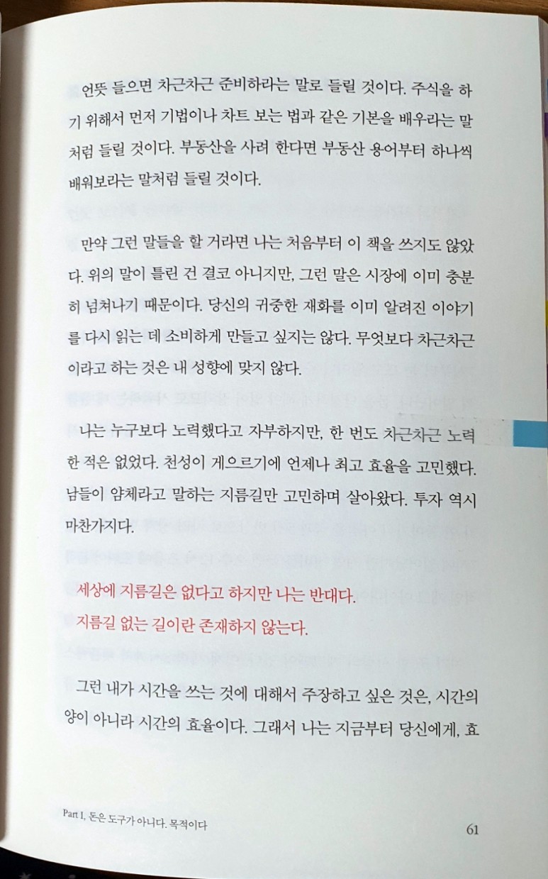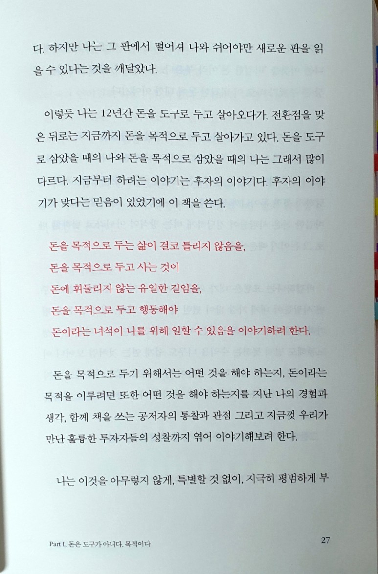 노동수익만으로 절대 원하는 돈을 얻을 수 없다. 돈을 목적에 두는 삶이 결코 틀리지 않음을, 돈을 목적에 두는 것이 돈에 휘둘리지 않는 유일한 길임을, 돈을 목적으로 행동해야 돈이라는 놈을 나를 위해 일할 수 있음을 이야기하고자 한다.혹자는 인생의 목적에 돈을 쓰는 것이 너무 세속적이라고 생각한다. 그러나 살아가는 모든 것은 결국 세속의 영역에 있으며 평안과 안위를 바라는 것은 인간의 당연한 욕망이라고. 이 부분에서 늘 인간의 본질적인 욕망을 강조하던 자신의 말이 떠올랐다. 돈이 전부는 아니다. 단돈 한푼 없이 행복할 수 있을까. 결국 나 자신과 나의 소중한 사람들을 지키기 위해서는 돈은 꼭 필요한 존재다.