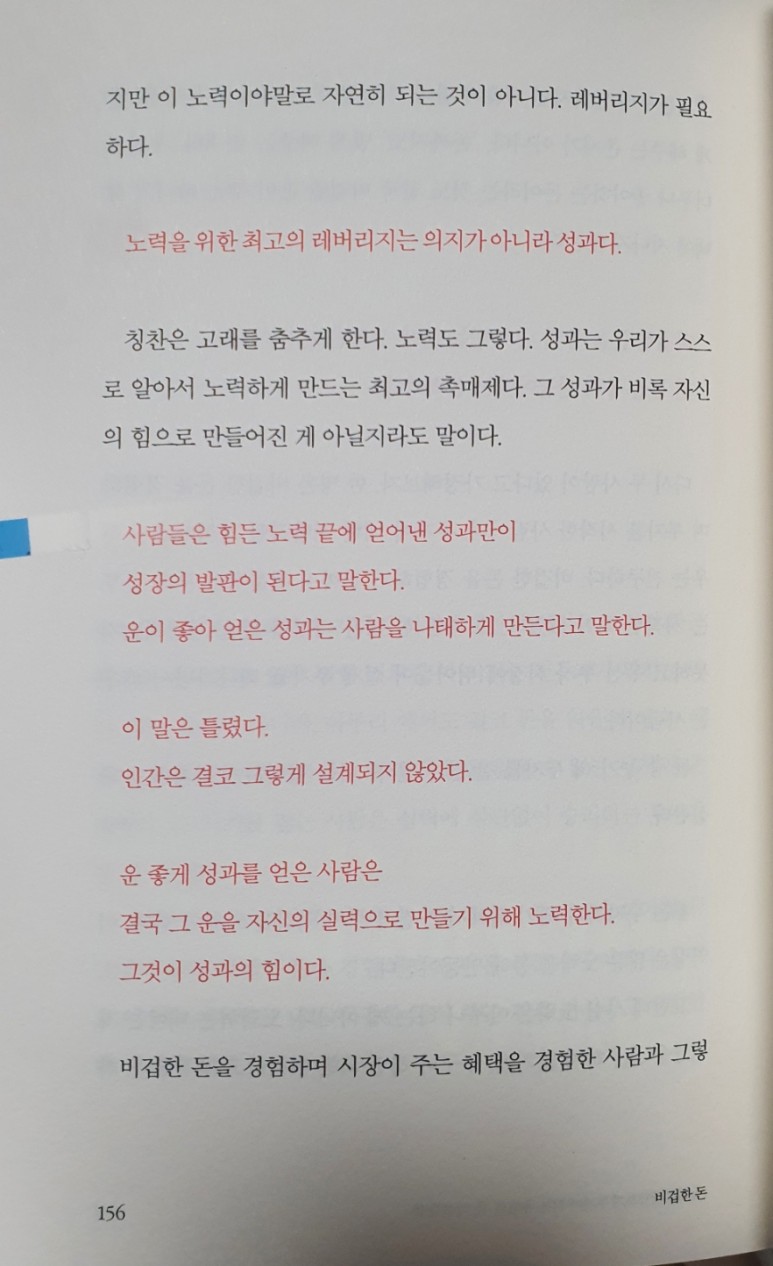 최고의 동기부여, 노력을 위한 최고의 레버리지는 의지가 아니라 성과다.운 좋게 성과를 얻더라도 결국 그 운을 자신의 실력으로 만들기 위해 사람들은 노력하게 돼 있다고. 그것이 바로 성과의 힘.쉽게 말해 내가 하고 있는 블로그도 내가 원하는 성과를 내기 때문에 그 성과를 유지하기 위해 더 노력하게 된다. 내가 열심히 해도 결과가 좋지 않으면 그게 동기부여가 될까. 블로그도 그렇고 투자도 그렇고 모든 게 결국 노오력으로만 되는 게 없다.
