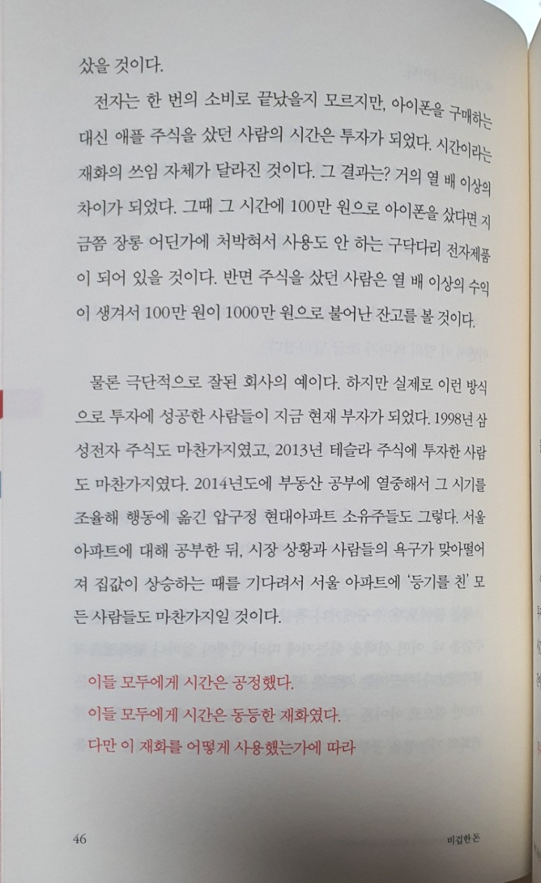 무언가를 이루려면 거기에 당신의 시간을 활용해야 한다. 시간이 금이라는 것은 말 그대로 시간이 금과 같은 재화라는 것. 그들 모두에게 시간은 공정하고 동등한 재화였다. 다만 이 재화를 어떻게 사용했느냐에 따라 결과는 달라진다.책을 읽을수록 정말 ‘효율성’을 굉장히 중요시하는 편이라고 느꼈다. 우리가 단순히 미라클 모닝을 한다고 일찍 일어난다고 모두 생산적인 사람일까? 기상시간과 상관없이 할 일을 얼마나 몰입감을 갖게 하고 완성했느냐가 훨씬 중요하다고 말했다. 물론 그 과정이 중요하지만 과정보다 중요한 것은 결과라고.