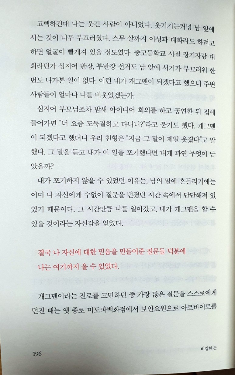 개그맨에서 투자자가 되기까지 다른 사람들의 비웃음을 받았다고 하는데, 여기서 포인트는 “본인에게 끊임없는 질문을 하면서 나를 알아간다”고 생각한다. 남들은 그 속사정을 모르니까 단순히 ㅋㅋㅋㅋㅋ 너가? 네가 개그맨이야? 네가 투자자?라고 비웃을 수 있다. 하지만 끊임없는 고민과 생각을 하면서 잘할 수 있다는 확신을 얻게 됐다.