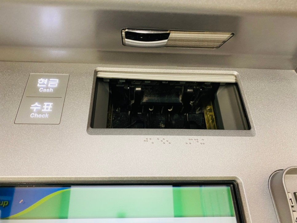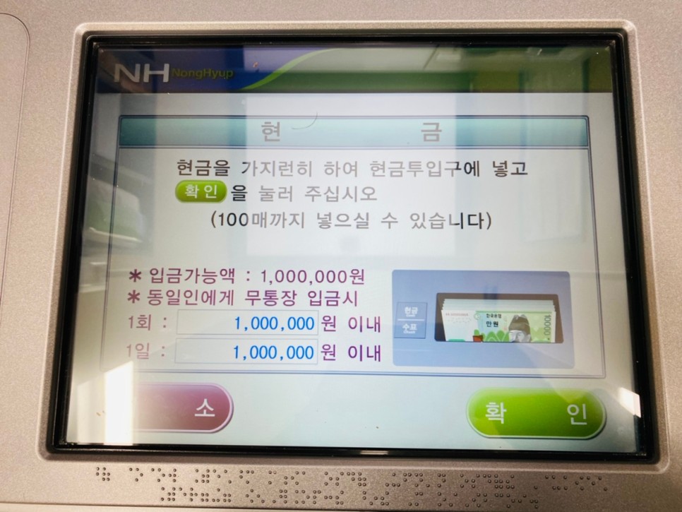 넣으려는 현금을 저기 여는 창구 쪽에 제대로 넣은 후 본인이 넣으려는 정보가 맞는지 다시 한 번 확인해 보세요.