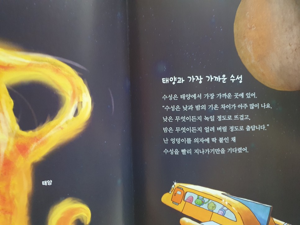 태양계를 소개하고 있는 페이지인 태양을 시작으로 수성~해왕성까지 (책을 읽다 보면 학창시절 머리글자만 술술 달 익힌 게아직도 떠올랐다고 한다)