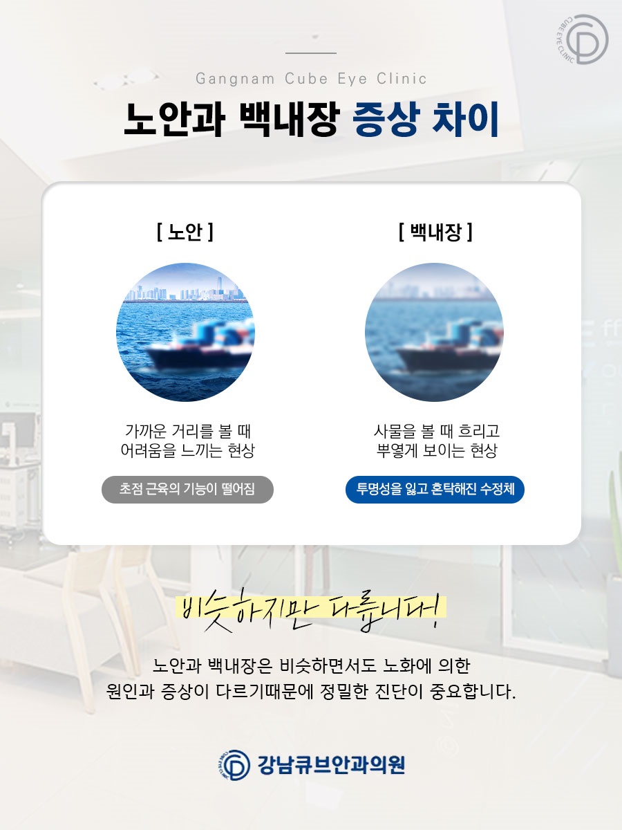 노안과 백내장은 함께 동반되는 경우가 다반사여서 환자가 이를 잘 인지하지 못하지만 조금이라도 시력이 떨어지거나 눈에 이상 증상이 나타나면 검진을 받는 것이 좋습니다.