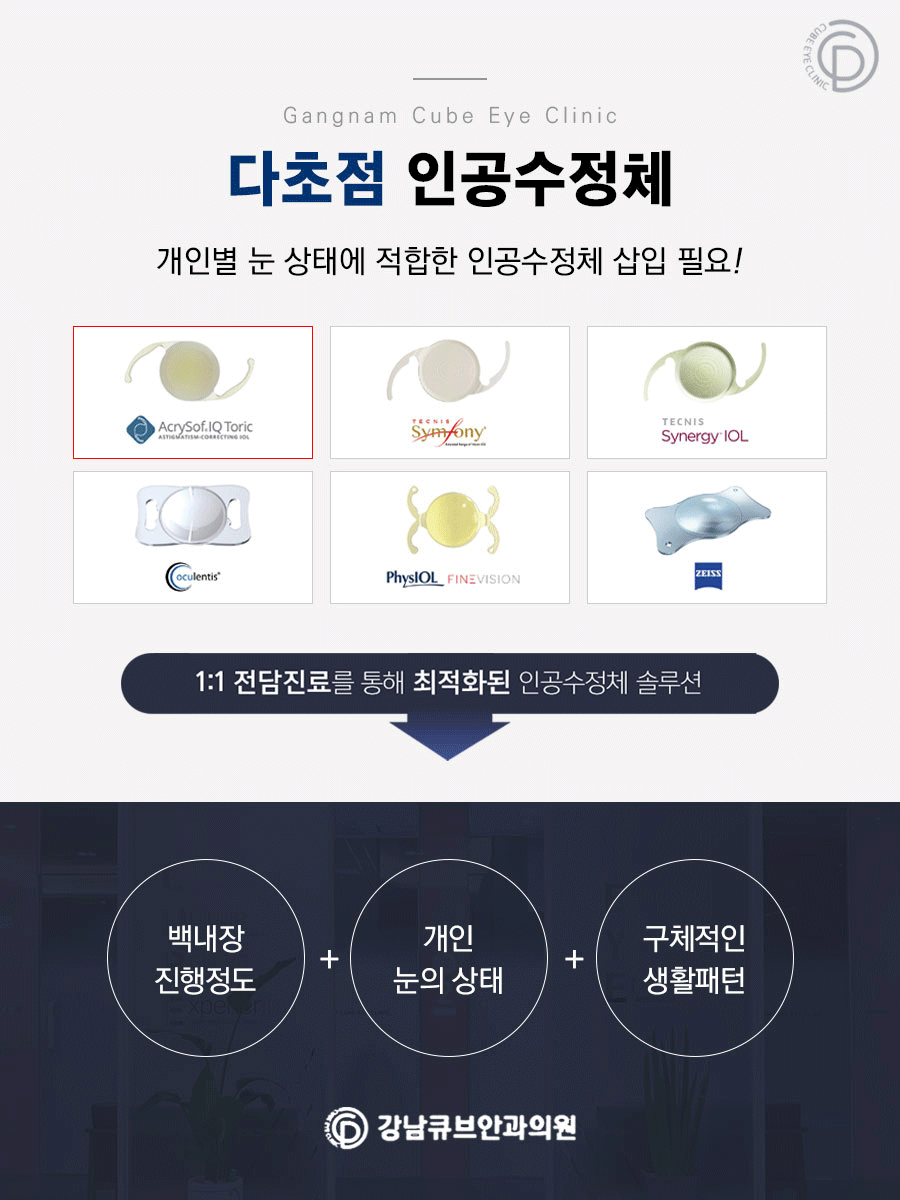 인공수정체는 단순히 환자의 시력이나 증상만 보고 결정하는 것이 아니라 백내장 진행 정도 및 각막과 망막 상태, 타안질환 여부 등을 꼼꼼히 파악하고 개개인의 직업이나 취미생활, 구체적인 생활패턴 등을 종합적으로 고려하여 맞춤형 인공렌즈를 적용해야 합니다.
