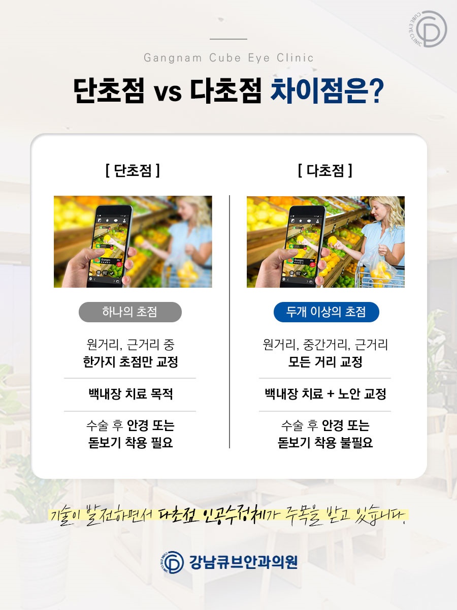 그러나 백내장 치료 목적으로만 수술을 하는 경우라면 원거리, 근거리 중 하나의 초점만 교정할 수 있는 단초점 렌즈를 삽입해도 괜찮습니다. 다만 수술 후 교정기를 착용해야 하는 번거로움이 있으므로 전문의와 충분히 상의한 후 환자의 눈 상태에 맞는 것을 선택하는 것이 좋습니다.