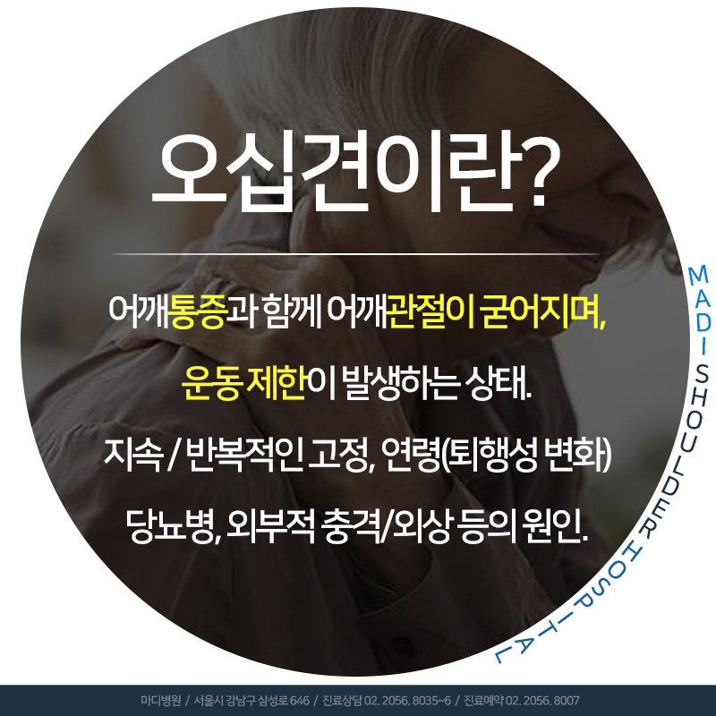 오십견(유착성 관절포염)이란 무엇인가요?바로 어깨 관절을 둘러싸고 있는 관절낭에 염증 유발 물질인 사이토카인이 분비되고 이로 인한 만성 염증으로 인해 잠을 잘 수 없을 정도로 심한 통증을 유발하는 질환입니다.시간이 지나면서 염증이 가라앉고 통증이 줄어들기도 했지만 관절낭이 두꺼워지고 섬유화가 진행되면서 상-완-골에 유착된 어깨를 마음껏 움직이기 어려워지고 밤이 되면 통증이 심해지는 양상을 보여 만성 수면장애의 원인이 되기도 합니다.
