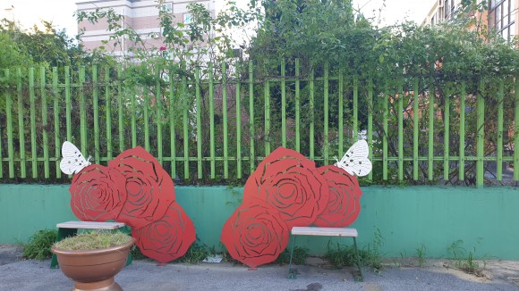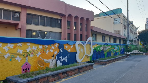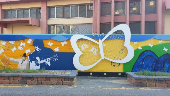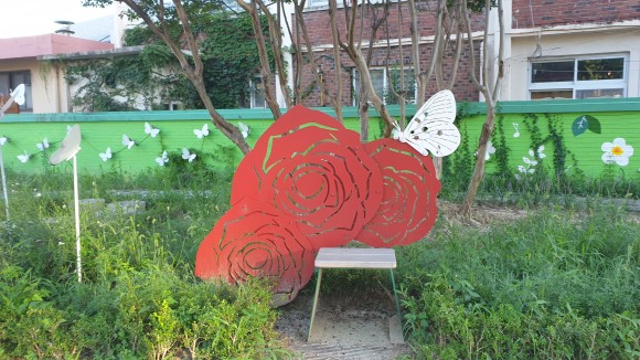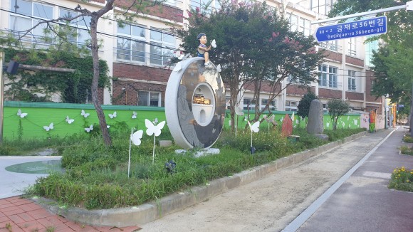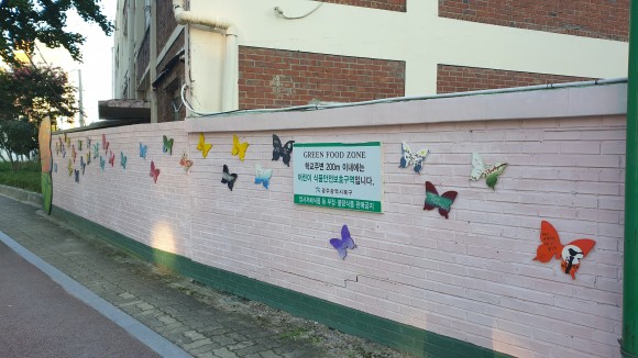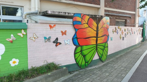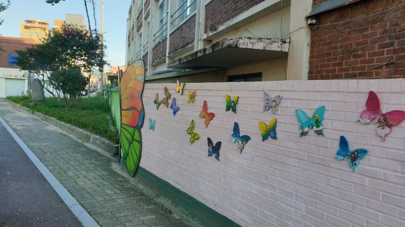 광주 수창초등학교 후문 쪽 벽에는 인증샷을 기념해 찍을 수 있는 매우 큰 호랑나비와 작은 나비가 날아다니는 나비 모양판에 화려한 바탕색을 칠하고 ‘흔들리지 않고 피는 꽃이 어디 있겠는가’와 ‘어두운 밤 구름 위로 저 달이 떠오르면’, ‘꽃잎은 시들어도 슬퍼하지 말라’ 그리고 ‘길 잃은 새 한마리의 길을 찾는다’ 등의 글씨가 적혀 있다.