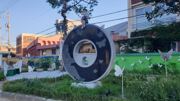 김정호 동상과 함께 뒤에는 음표를 형상화한 하얀 나비 조형물이 광주 수창초등학교 담벼락 벽에 부착돼 잘 어울리네요.