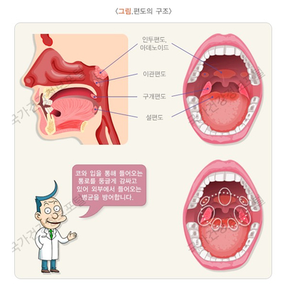 편도는 입과 코로 들어오는 항원에 반응하며 주로 점막 표면을 방어하기 위해 항체를 만들어 분비하는 조직입니다.