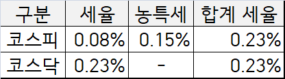 증권거래세, 증권거래세는 주식투자자가 기본적으로 내는 세금이고 우리가 자주 주식을 할 때 내는 세금이 증권거래세라고 생각하면 되는데요. 네이버 시사상식사전에서는 증권거래세를 주식이나 출자지분 소유권이 유상 이전될 때 해당 주권이나 지분 양도자에게 양도가액을 기준으로 부과하는 세금으로 정의합니다.즉, 거래소에서 주식 매각 시 발생하는 세금으로 주식 매수 시에는 발생하지 않습니다. 증권거래세율은 다음과 같습니다. 2023년부터 코스피 시장의 증권거래세는 폐지되지만 농특세는 여전히 남아 있어 코스닥과 같은 0.15%의 세금이 부과됩니다.