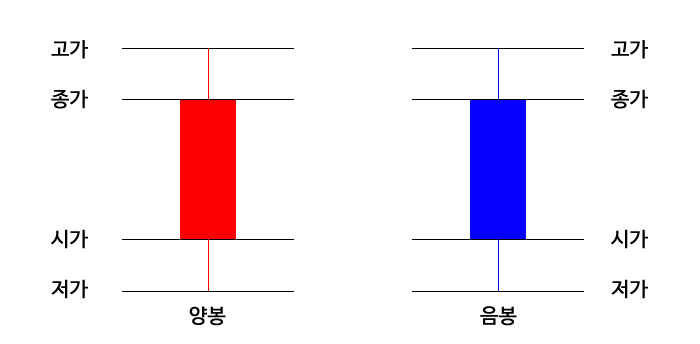 다음과 같이 세로로 긴 막대기가 우리가 흔히 말하는 양초와 모양이 비슷하여 양초봉이라고 불립니다. 빨간 막대는 양봉, 파란 막대는 음봉이라고 부릅니다.