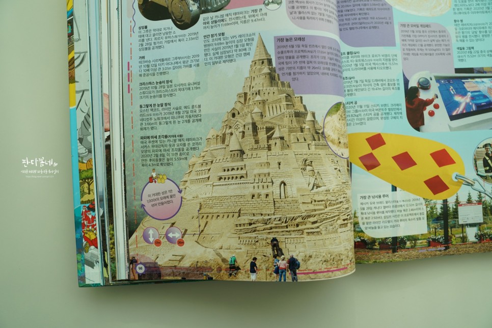 사실 기네스 세계기록 2022는 어른인 제가 봐도 너무 재밌어서:) 아이가 읽어달라고 가져왔을 때 매번 기분 좋게 읽을 수 있는 건 아니니까! 하지만 이건 제가 제일 먼저 환영하는 서적이기도 하지만 요즘 해외여행을 못 가서 더 그런 생각이 듭니다.기네스 세계기록 2022를 보면서 대리만족하는 느낌이랄까. 모래와 물로만 쌓은 모래성을 구경하고 세계박물관도 구경하고