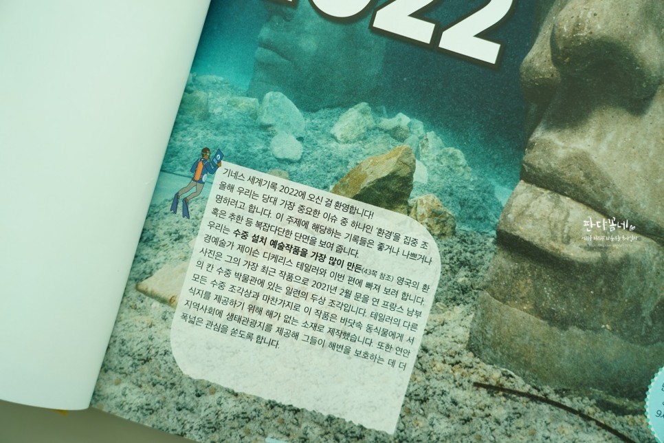 영국의 인기 도서이자 세계에서 가장 많이 팔린 저작권이 있는 연속 출판물이라는 놀라운 기록을 매년 갱신하고 있는 #기네스 세계 기록을 얼마 전 보니 2022년에 새로운 버전이 출간되어 있었습니다.특히 이번에는 기후변화가 만든 새로운 기록을 담은 내용이어서 좀 더 아이들에게 의미 있는 경각심을 심어줄 수 있을 것 같이 해고한 끝에 뽑게 되었습니다.- 결과적으로 너무 만족스러워요!