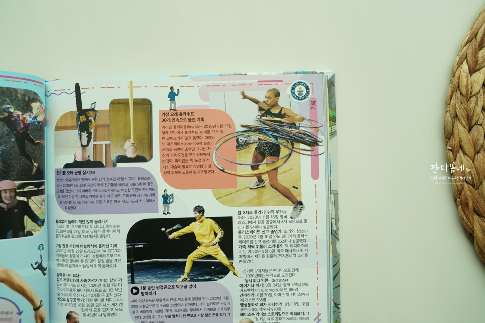 그리고 저는 두 번째 취향도 고려해야 했기 때문에 한글을 모르는 꿀순이도 잘 볼 수 있도록 실사에서 선명하게 볼 수 있는 어린이 백과를 선호했는데 #기네스 세계기록 2022편이 꼭 그렇게 만들어져 있었습니다.# 신기록을 풀컬러 사진과 함께 소개한 책이라 둘째권 육아도 OK! 너무 흥미진진하게 보고 있어요>.<