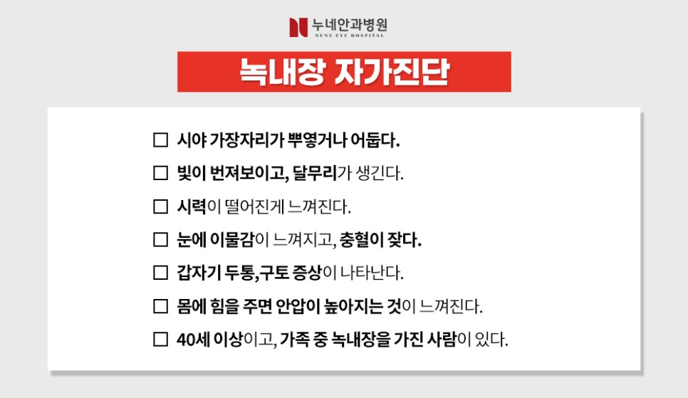 녹내장 자가진단을 통해 녹내장을 의심해볼 수 있습니다. 그러나 녹내장 증상이 나타난 경우는 이미 녹내장이 많이 진행된 결과일 수 있으므로 주의가 필요합니다. 치료시기를 놓치면 시력회복에 어려움이 생길 수 있으므로 녹내장 자가진단을 통해 증상을 미리 파악할 수 있도록 하며, 40세 이상은 1년에 한 번씩 정기검진을 통해 사전에 발견할 수 있도록 하는 것이 좋습니다.