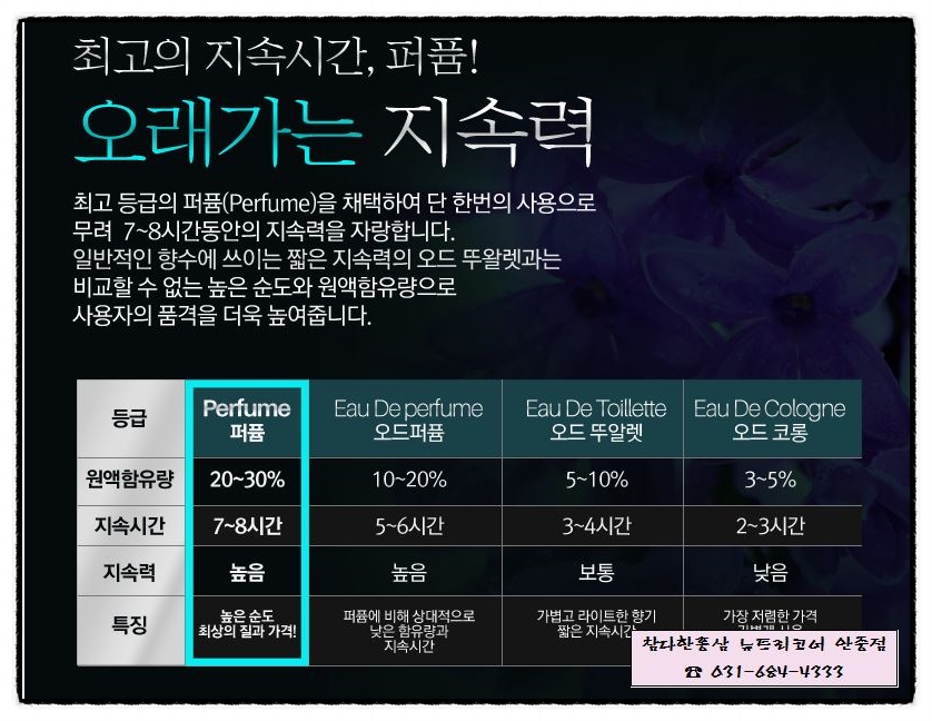 최고 등급의 퍼퓸을 채택하여 단 한번의 사용으로 7~8시간의 지속력을 자랑하며 일반 향수에 사용되는 짧은 지속력의 오드뚜왈렛과는 비교할 수 없는 높은 순도와 원액 함유량으로 사용자의 품격을 더욱 높인다고 합니다.