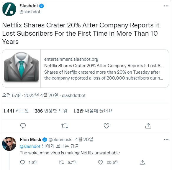 일론 머스크 테슬라 CEO는 넷플릭스 주가 폭락 기사에 자신의 의견인 “워크마인드 바이러스가 넷플릭스를 볼 수 없게 만들었다”고 트위터를 올리기도 했다.