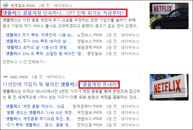 또 넷플릭스 공유 계정 단속에 관한 내용도 이야기가 나오는 중인데 넷플릭스의 경우 요금제별로 동시 접속 수가 1명에서 4명까지 가능하다고 기업에서 생각한 공유는 가족 구성원이나 동거인이 계정을 함께 쓰길 원했지만 지인들끼리 사용하는 분들이 많다.