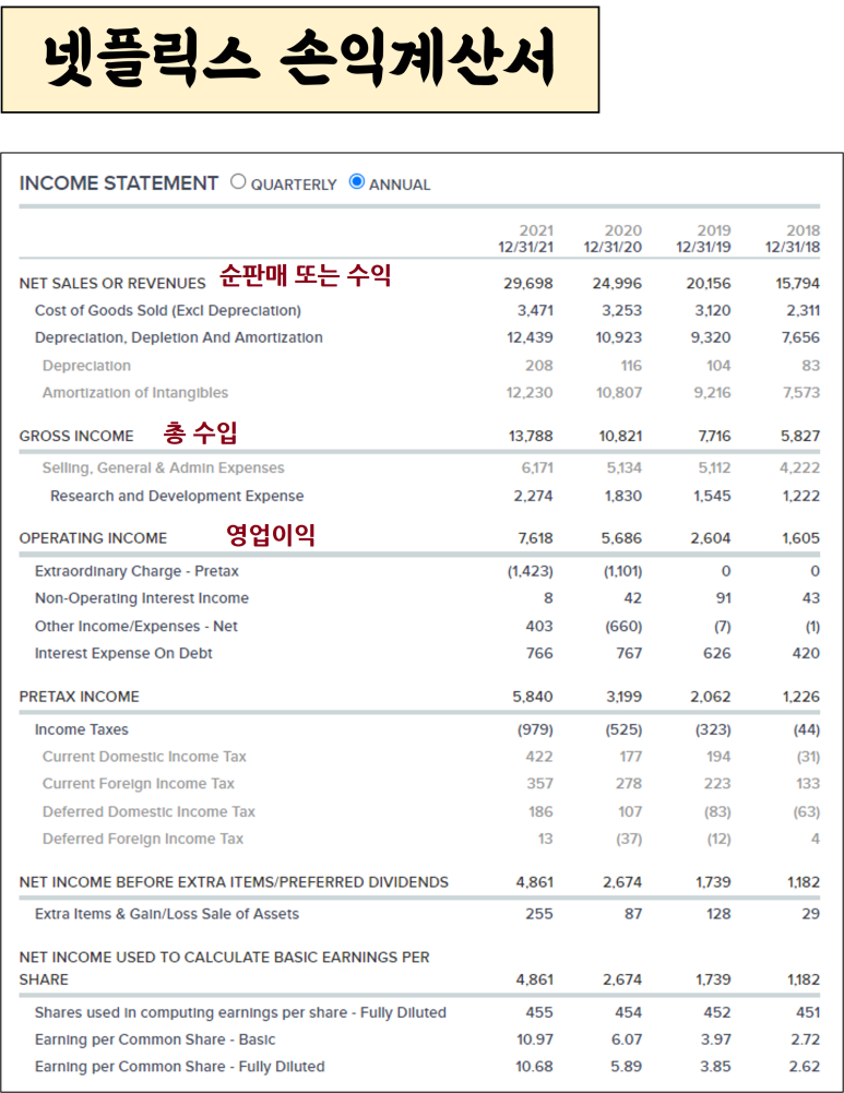 넷플릭스 연간 손익계산서도 조금만 살펴보면 순판매 및 수익은 증가해왔다.수입도 증가하는 가운데 영업이익도 증가하는 모습을 보였다