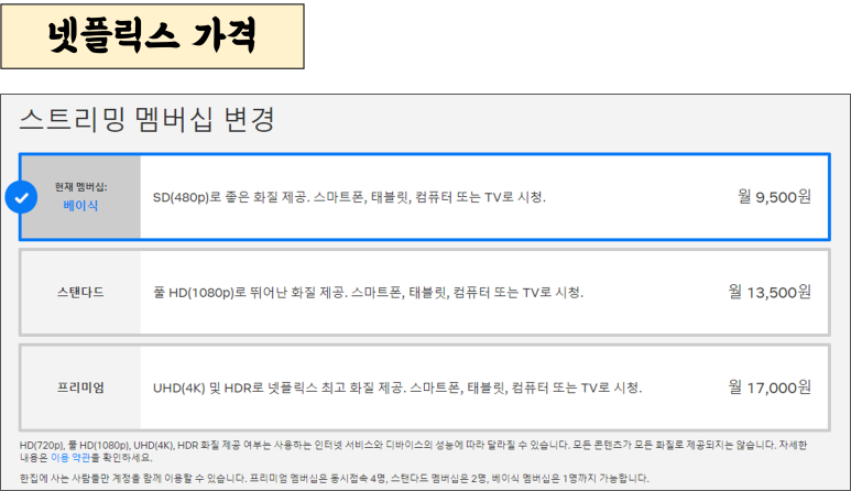 넷플릭스의 가격은 등급별로 다르지만 3가지로 나뉘는 베이직, 스탠다드, 프리미엄으로 나뉘며 화질 및 동시접속 수에 따라 가격이 다른 베이직 9500원, 스탠다드 13500원, 프리미엄 17000원이지만 저렴한 가격은 아닌 것으로 보인다.