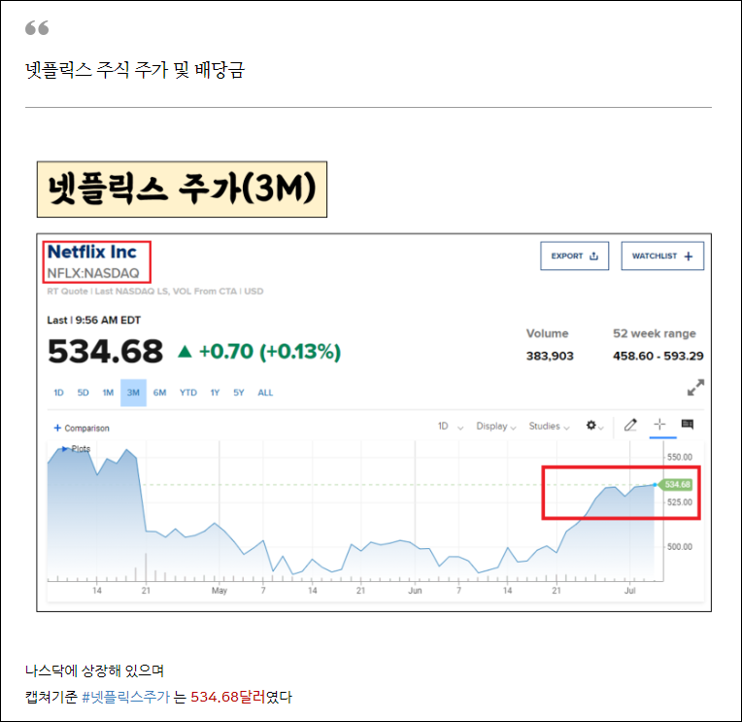 앞서 넷플릭스에 관한 포스팅을 한 것은 2021년 7월 6일이었다.당시 주가는 534.68달러로 500달러 선을 유지하고 있었다