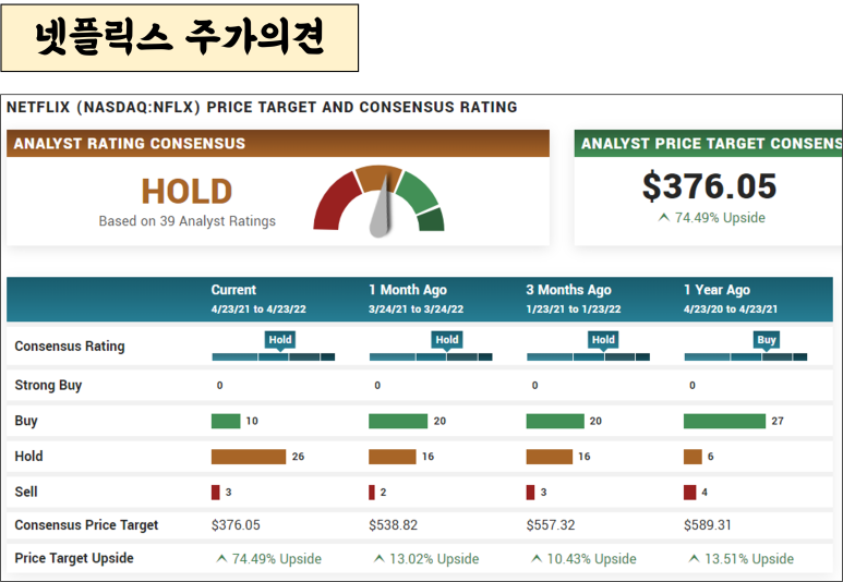마켓비트에서 애널리스트들의 넷플릭스 주가 의견을 보면 이와 같은 것으로 받아들여져야 한다는 의견이 많으며 현재 목표 주가는 376달러 정도이다