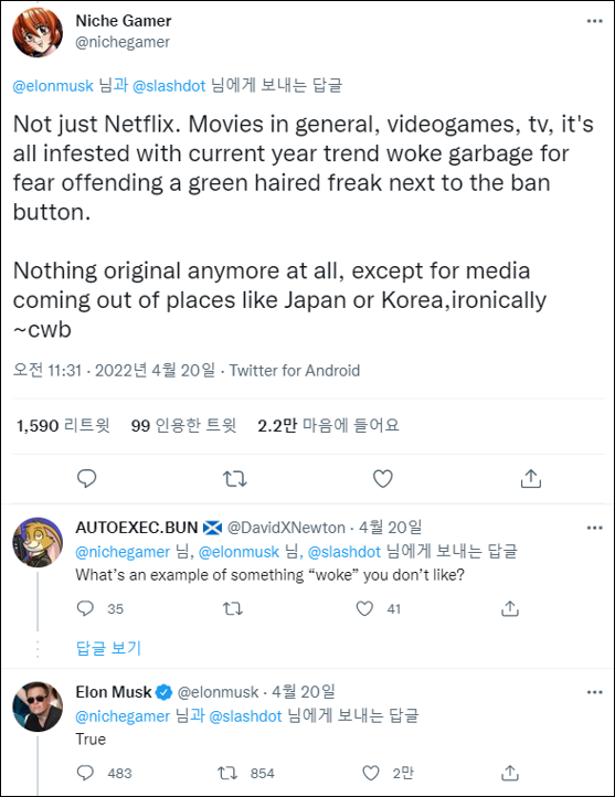 또 일본이나 한국에서 나오는 언론을 제외하면 독창적인 것이 없다는 의견에도 납득했다.이러한 일론 머스크 트위터를 보면 넷플릭스에 관해 긍정적으로 보고 있지 않음을 느낄 수 있다.