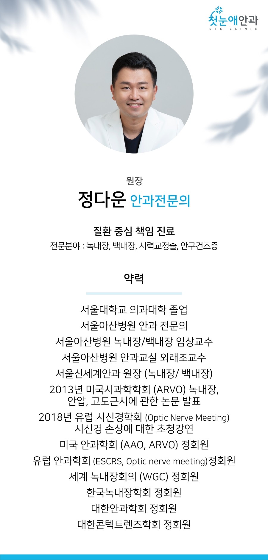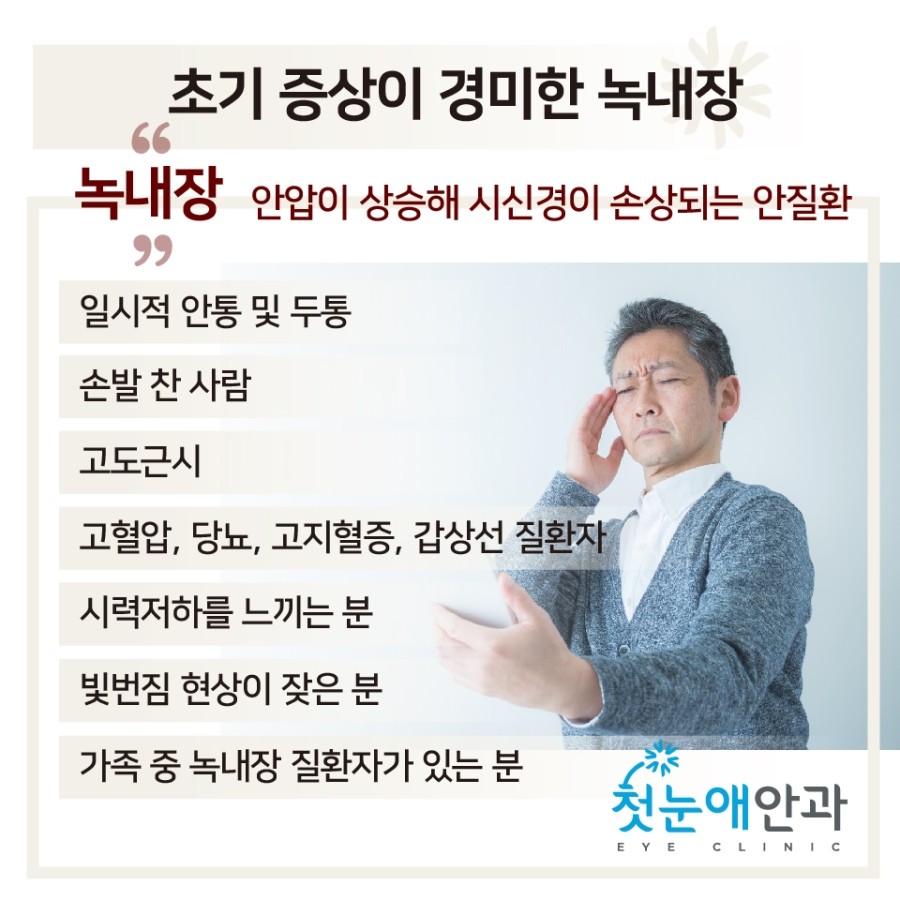 최근에는 녹내장이 발병하는 연령층이 낮아지고 있습니다.주요 원인은 고도근시와 가족력이 있습니다.