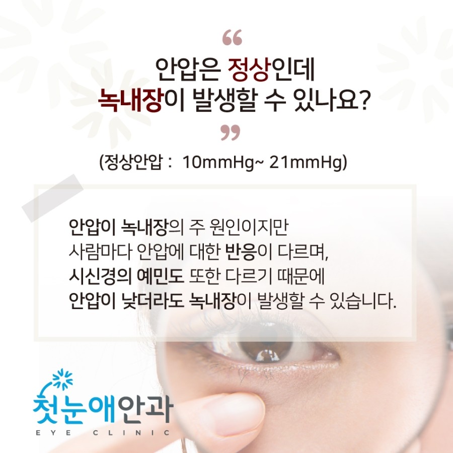정상 안압 녹내장은 정상적인 안압이지만 시신경이 손상을 입게 됩니다.그만큼 다른 사람에 비해 약한 시신경을 가지고 있다는 의미이기도 합니다.