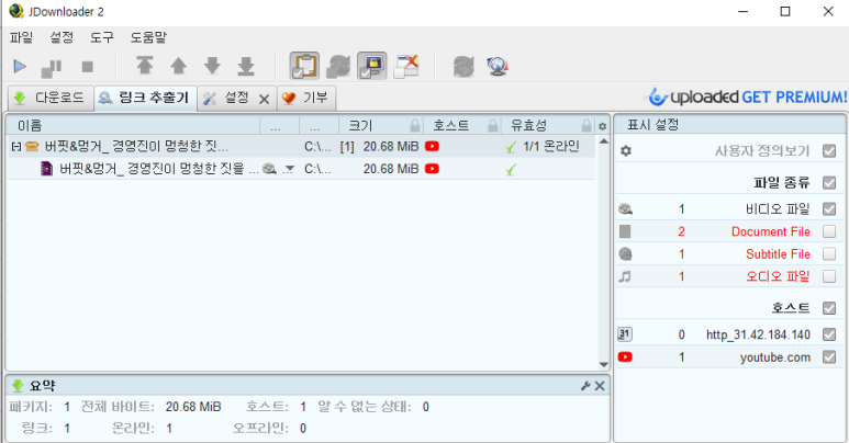 크롬 다운로드 창에서 링크 주소를 복사하고 jdownloader 링크 추출기 창에서 Ctrl+V를 눌러 잠시 기다리면 다운로드 링크를 감지하여 링크를 추출한다.본인은 유튜브 주소를 아무거나 베껴 붙였다. 유튜브 동영상 다운로드도 가능하다.