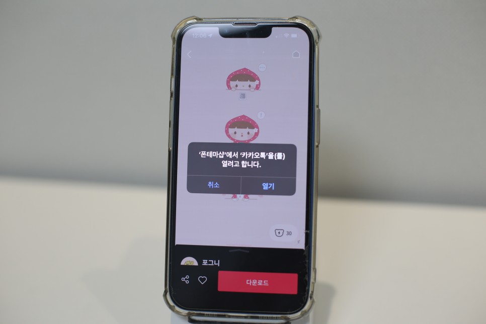 지금부터 본격적인 다운로드 및 설정 과정입니다. 광고를 보시면 테마 다운이 완료됩니다. 핸드폰 테마숍에서 카카오톡을 열려고 합니다.라고 하는 팝업창이 하나 나타납니다. 열기를 누르고 들어오세요.