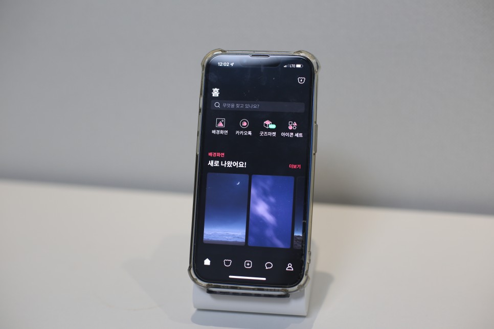 앱을 켜면 다양한 메뉴가 나옵니다. 배경화면, 카카오톡, 굿즈마켓, 아이콘 세트가 표시됩니다. 이 가운데 오늘은 아이폰 카카오톡 테마 다운을 위해 ‘카카오톡’을 누르고 진입합니다.