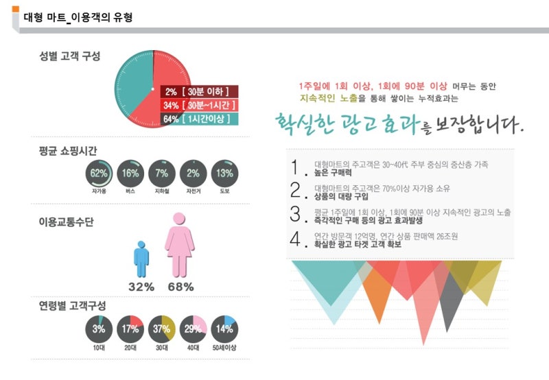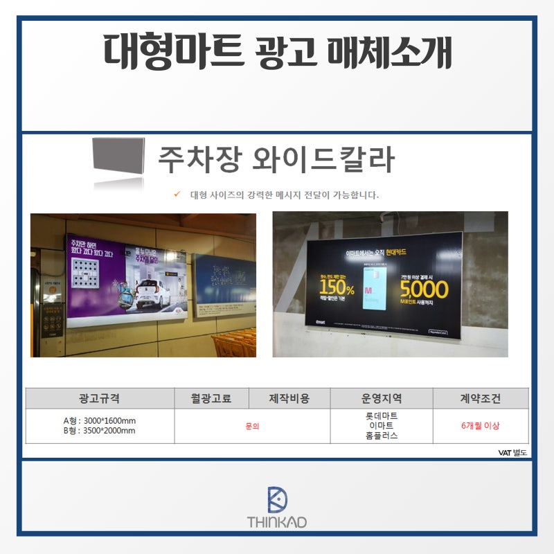 보통 마트에 오는 사람 중 차를 가져오는 사람은 지역 주민인 경우가 많고 기본적으로 소비를 할 의지가 있고 어느 정도 경제력도 있어서 타겟팅이 쉬워 항상 인기 있는 자리입니다. 주차장 광고는 넓은 주차장을 활용한 광고매체 주차장을 이용하는 고객에게 자연스러운 노출 단기적 이벤트 광고에 특히 효과적
