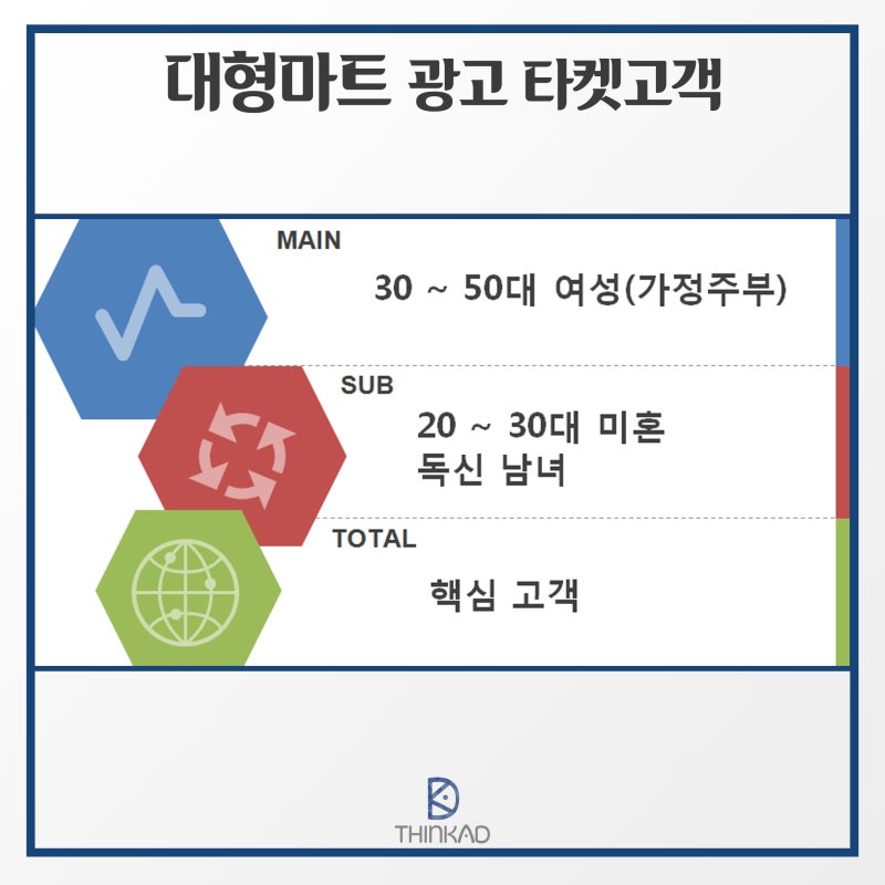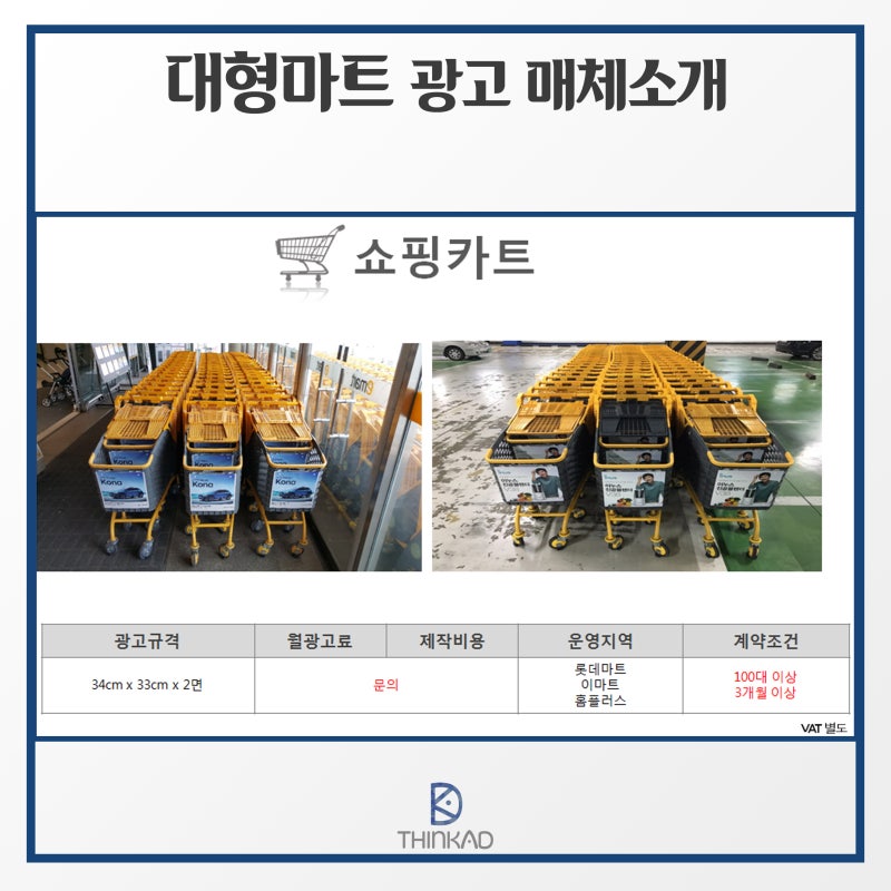 대형 할인점 광고 중 쇼핑카트 광고도 매우 인기 있는 광고 방법이지만 대형마트에서는 90% 이상의 고객이 쇼핑카트를 들고 다니기 때문에 쇼핑카트를 든 사람, 마트 안에서 쇼핑을 하는 사람에게 자연스럽게 노출될 수 있습니다. ^^ 장소 한정 없이 고객 동선에 맞춰 지속적으로 노출 가능 평균 쇼핑시간(90분) 동안 지속적으로 노출되는 고객의 90% 이상이 장바구니를 이용하는 장바구니 3면(양면) 광고 부착으로 광고 노출이 높다.