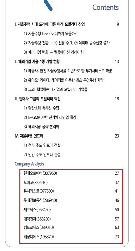 1. 소프트웨어 TopPicks: 차량 전반의 SW를 공급하는 현대오토에버, 커넥티드카 SW 공급업체 오비고가 있다. 인프라 및 시범 운행 중인 롯데정보통신, ADAS 기반 모니터링 사업을 진행 중인 유니퀘스트를 투자 유망주로 제시한다.