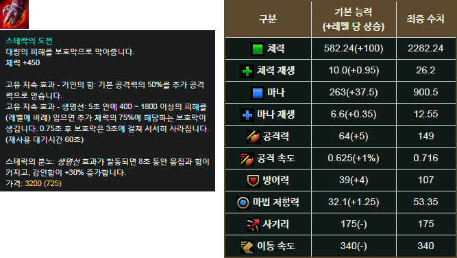 전사형 챔프답게 스텝 성장치가 좋습니다. 특히 업당 체력 100을 획득하며 여기서 토포 250+스텔락 450 체력으로 보통 2코어가 나올 때의 10~12레벨 구간에서 약 2300~정도의 체력통입니다. 따라서 간단하게 스텔락 효과가 발동됩니다.
