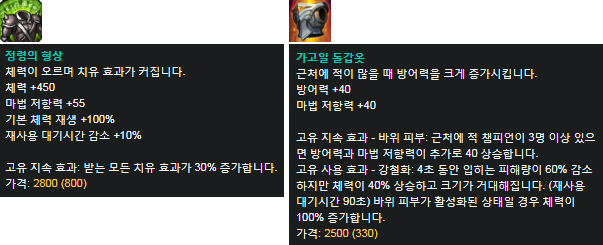 3코어-정령의 형상(적 정글, 미드 AP가 잘 자랐을 때) 3코어-거고일의 갑옷(우리 팀의 조합 텐이 없거나 내가 이니시를 하는 경우가 많을 때, 적 AP가 약할 때)