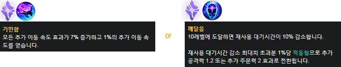 토포이속, 유체화, 광망을 통해 충분히 이동속도를 갖춘 상태입니다. 거의 오버하는 것처럼 넘치네요. 그렇기 때문에 또 이 속도를 높이면 조금 헛수고가 될 수도 있습니다. 그래서 보통 깨달음으로 <추가 쿨감 10%>를 꼽습니다. 쿨감 30%를 맞추는 겁니다.