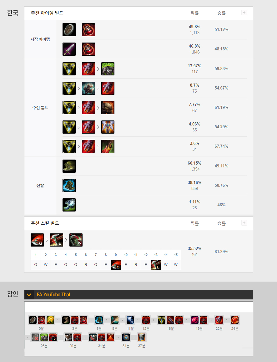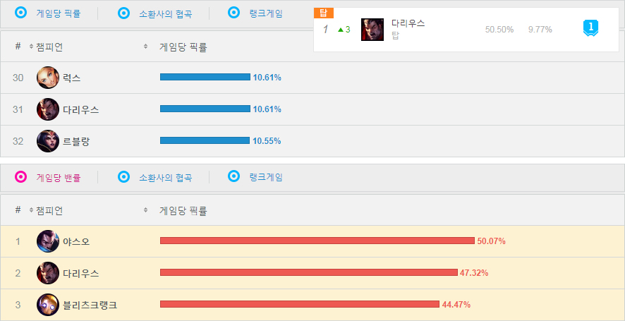 특성 자체가 돌진기도 없고, 이 동기가 느리기 때문에 멈추면 한없이 말리거나, 킬을 한 번 먹으면 계속 먹거나 좋거나 나쁘거나 게임을 폭발시키는 경우가 많습니다. 그러다 보니 벤율이 무려 47%, 최근에는 톱1 티어까지 오르는 등 무서운 상승세를 보이고 있습니다.