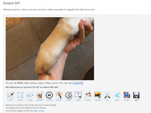 파일을 선택한 후 제가 기본적으로 사용하는 기능은 많지 않습니다. 왼쪽 상단의 리사이즈로 전체 해상도를 낮추거나 크롭에서 원하는 부분만 가져옵니다. 비디오 길이가 길 때는 Set Start와 End를 지정하여 원하는 영역에서만 GIF를 작성하면 됩니다.
