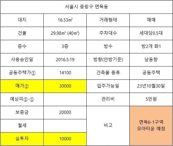 총 6층 중 4층으로 엘리베이터 유 2016년 준공 투룸으로 상태가 좋아 현재 보증금 7천만원에 실투 21000만원 이런 매물은 다 사서 없애야 하는데…이상 끝.편안한 휴일 보내세요. 면목동 모아타운 3단계 사업장 하반기 선정 지사가 가정역 면목역 이용 모아타운 지정시 면적 노후도 완화