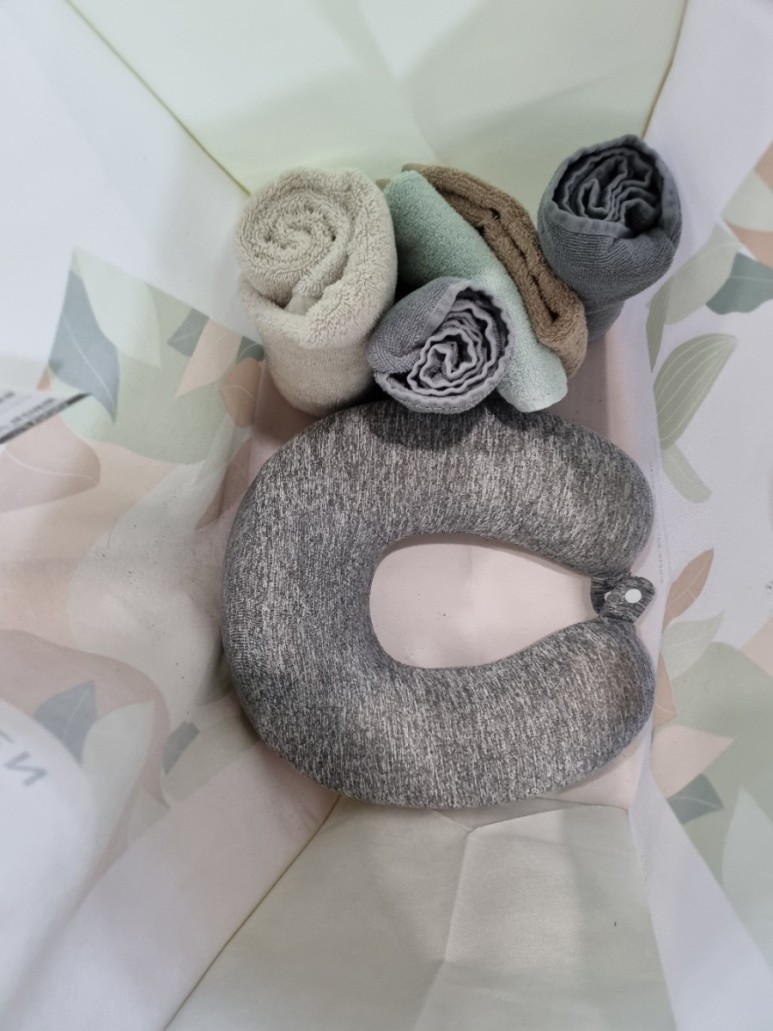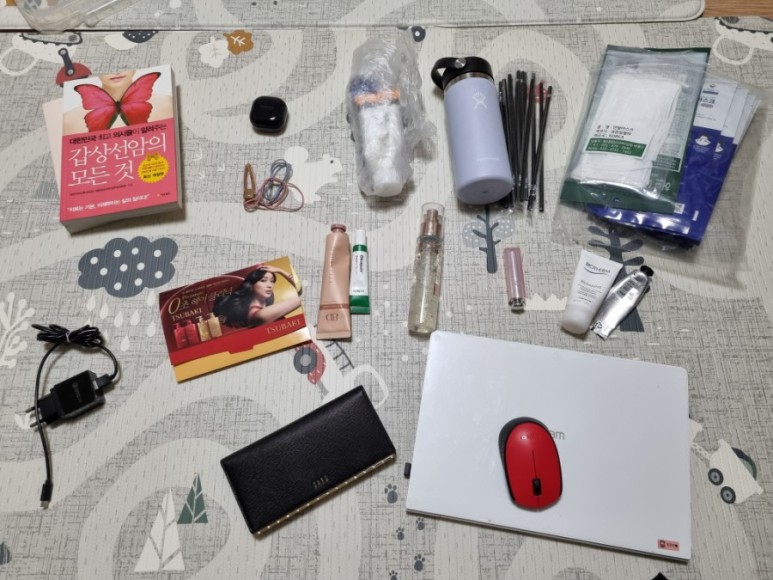마스크텀블러,빨대생수(사먹어도됨) 미스트 헤어고무 이어폰 스킨케어 제품 치약,칫솔,클렌징 립밤 이것저것 샘플(사용안했어요ㅋㅋㅋㅋㅋ) 충전기 노트북지갑(신분증) 핸드크림 목베개 속옷(보호자생각 수건2개,미니타올2개) 가디건